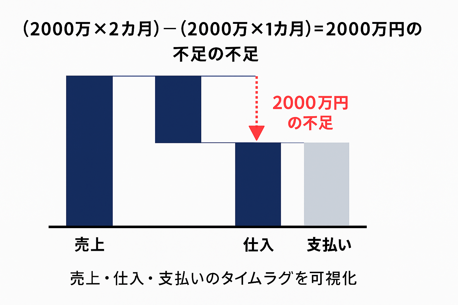 2000万円の仕入れに対し、支払期間とのズレを加味すると、合計4200万円の資金が必要になります。